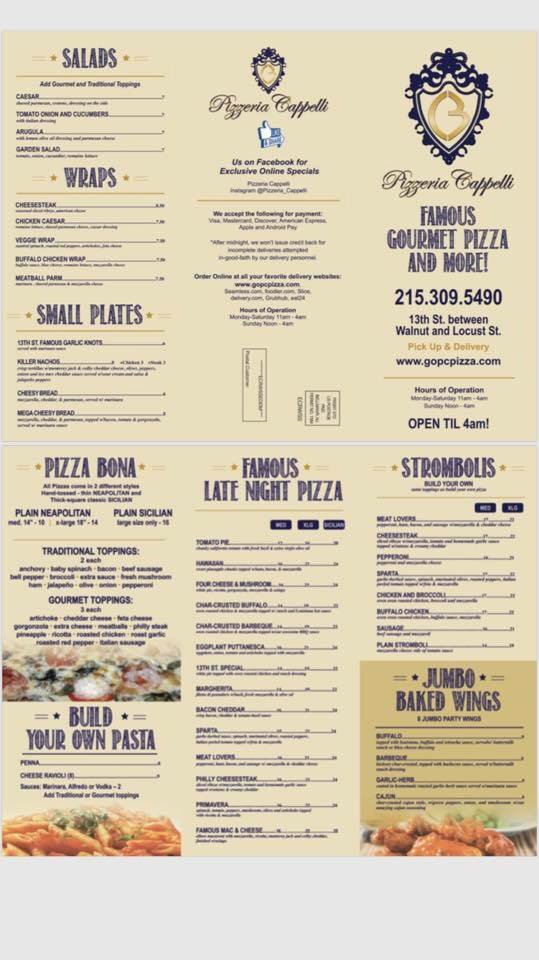 Welcome to Pizzeria Cappelli, a culinary gem nestled in the heart of Philadelphia at 209 S 13th St. This inviting establishment is perfect for casual dining, takeout, and delivery, catering to groups and kids alike. The menu is a delightful mosaic of flavors, featuring an array of wraps and sandwiches that elevate classic Italian ingredients. Don't miss the Cheesesteak Hoagie Wrap and the zesty Buffalo Chicken Wrap, expertly layered with fresh produce and savory sauces.